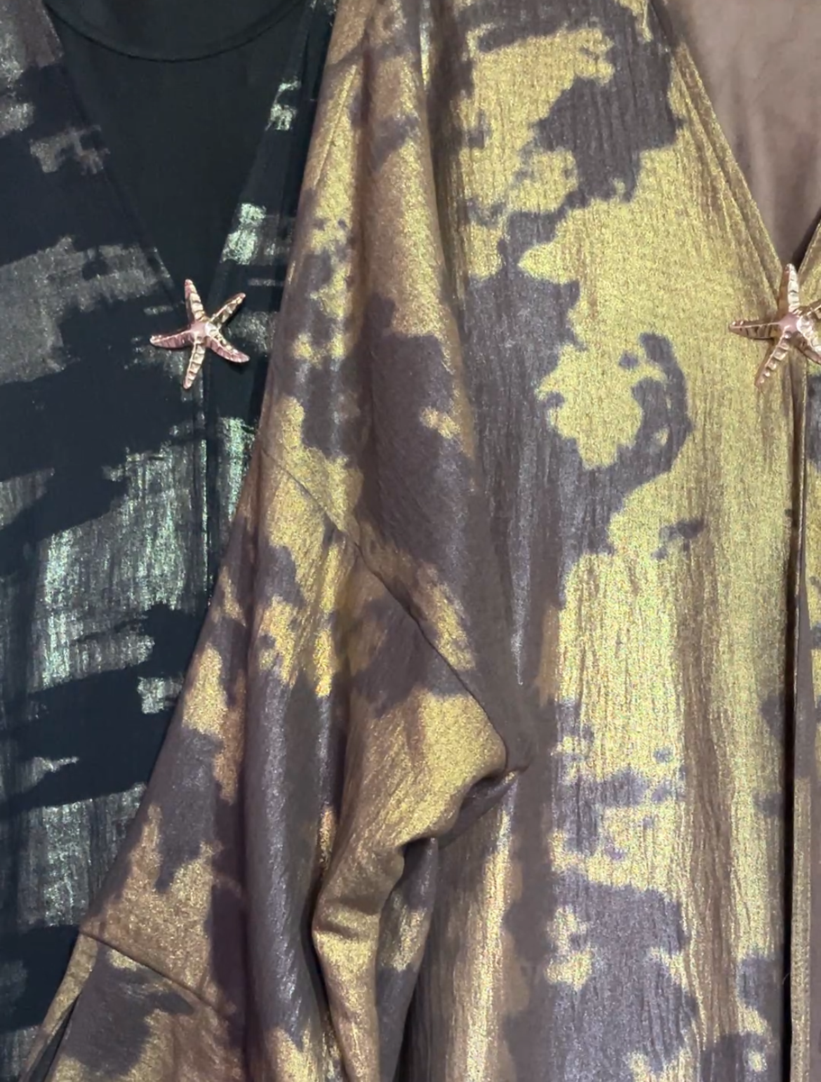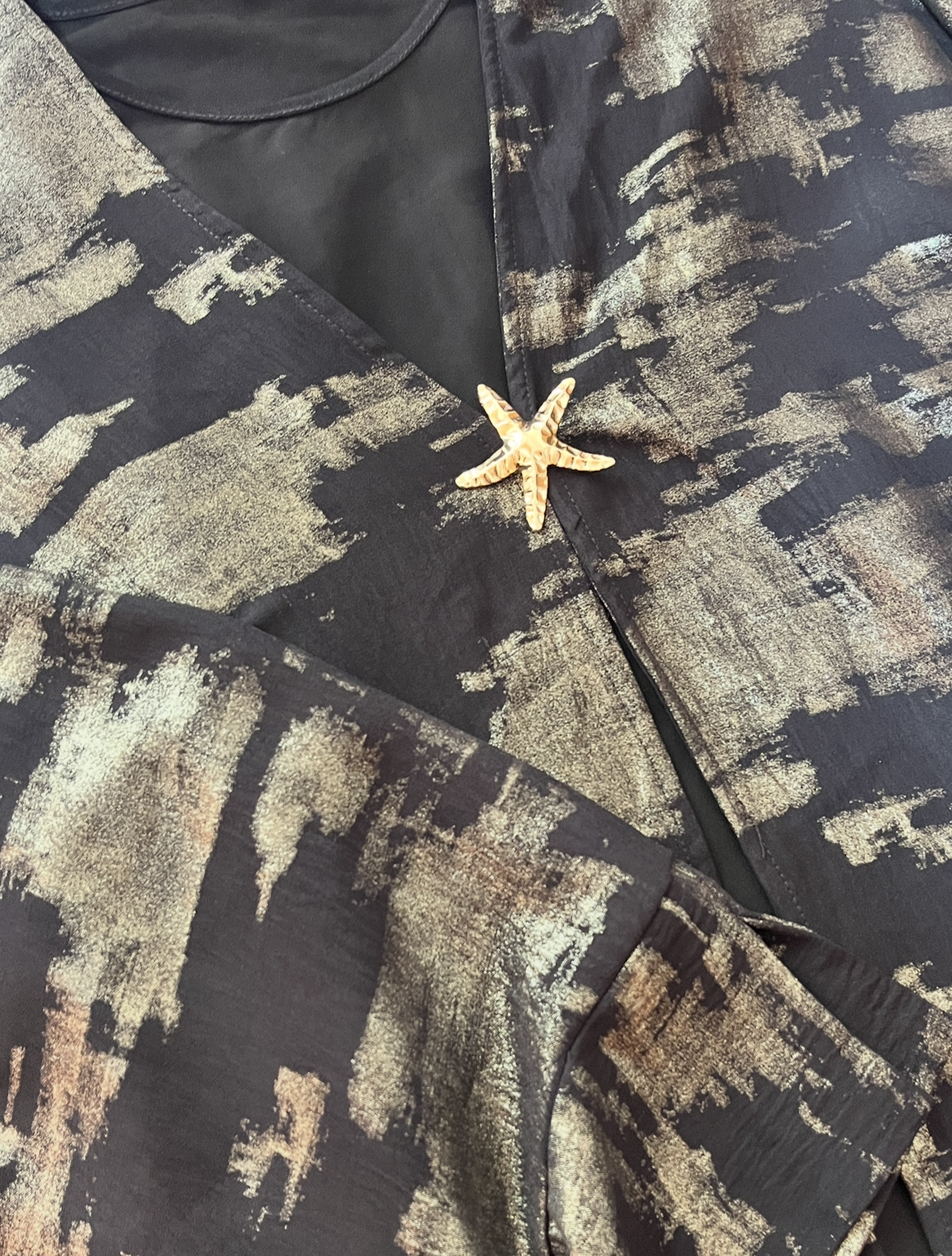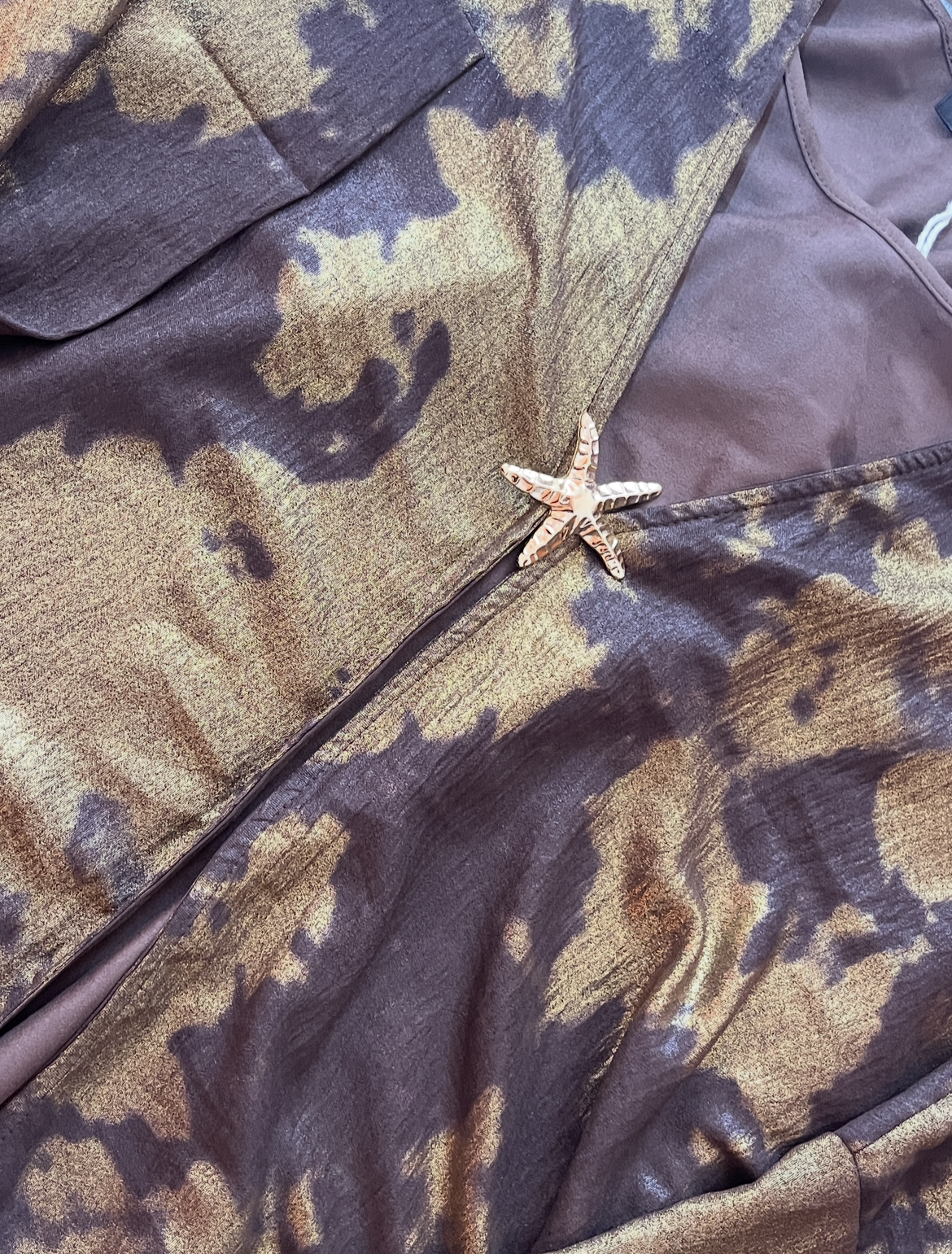 Le Kimono d’Apparat : Réalisé en Lin léger, il apporte une fluidité incomparable. Son imprimé “brushstroke” doré/argenté et sa broche étoile de mer ajoutent la touche de lumière finale.