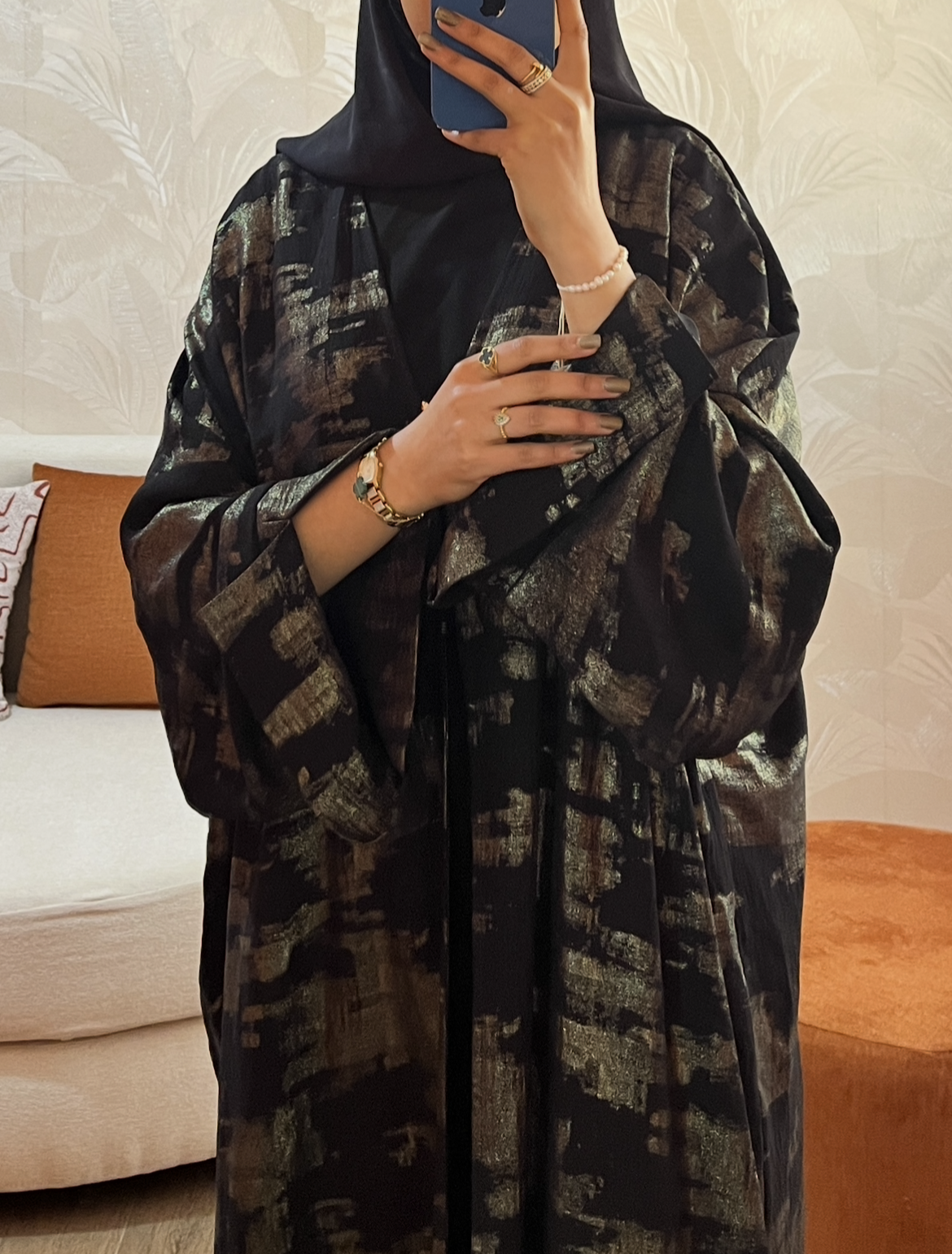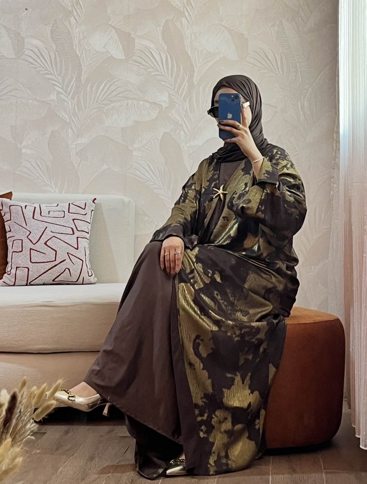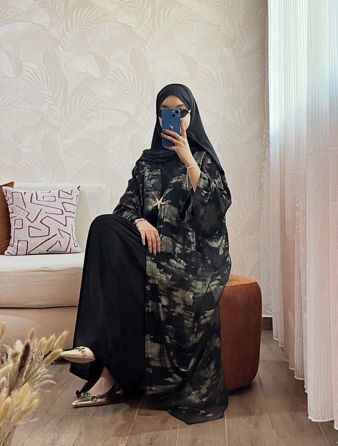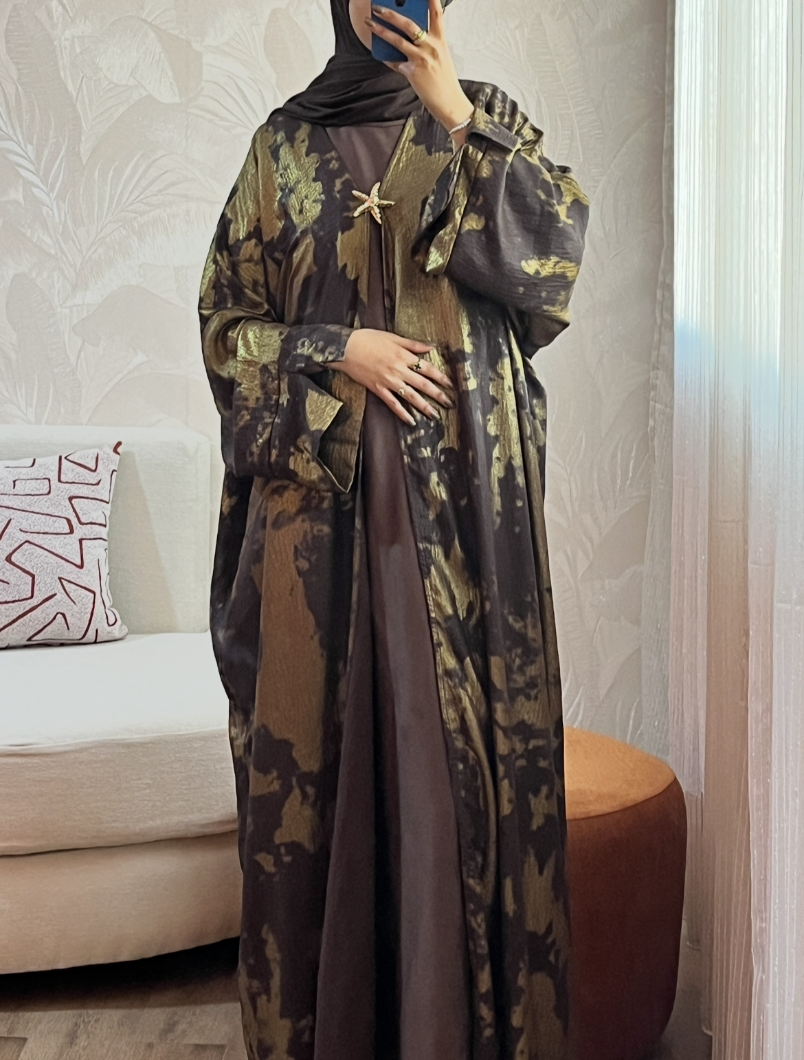 Le Kimono d’Apparat : Réalisé en Lin léger, il apporte une fluidité incomparable. Son imprimé “brushstroke” doré/argenté et sa broche étoile de mer ajoutent la touche de lumière finale.